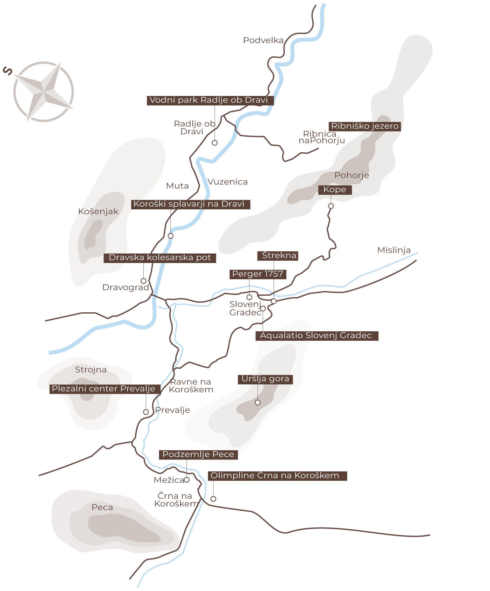 Water flows through all three valleys, uniting them into one – into Koroška. Fresh air blows from the slopes of Pohorje, the Karavanke, and the Savinja Alps. Fertile land hosts mighty forests, diverse gardens, and blooming meadows. Wood, metal, and minerals still peek out from the past, forging new experiences and making Koroška special in this regard as well. Explore it!
