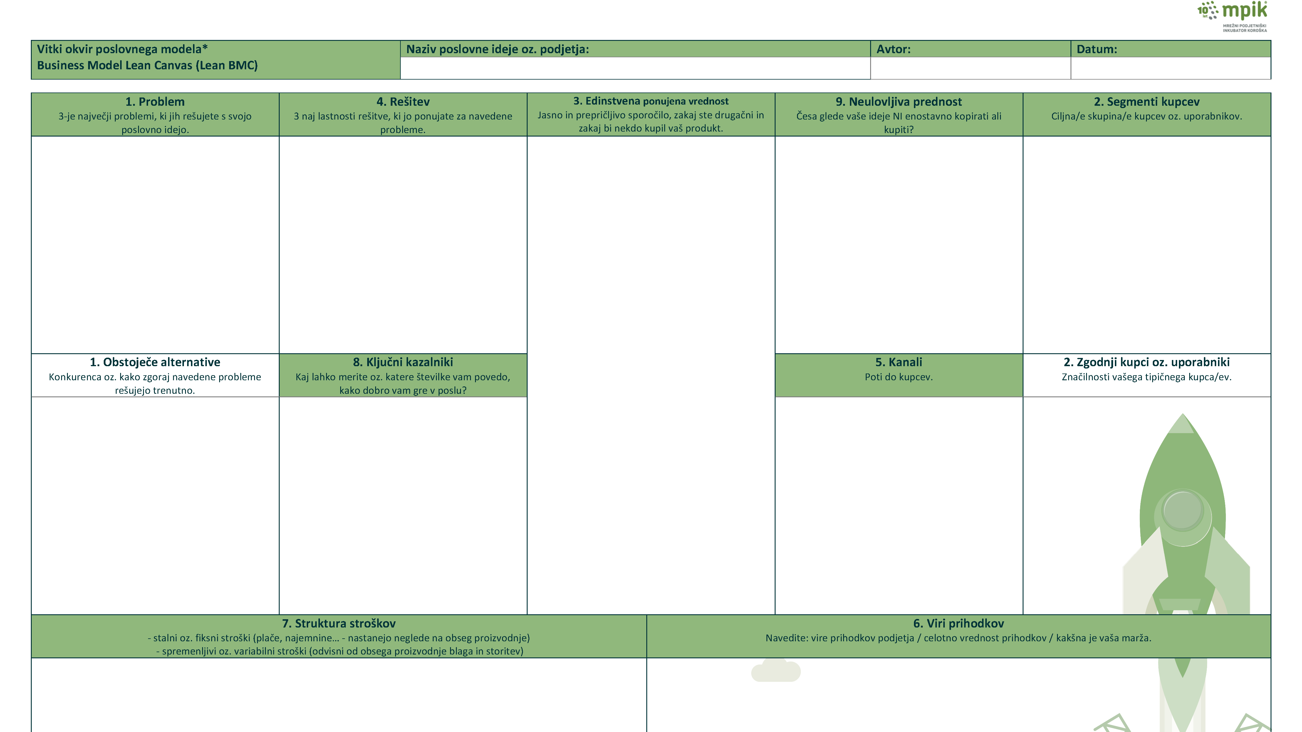 - Ključni kazalniki (ang. Key Metrics): Kaj lahko merite oz. katere številke (kazalniki / metrike) vam povedo, kako dobro vam gre v poslu? Kako boste vedeli, ali je vaša ideja uspešna?